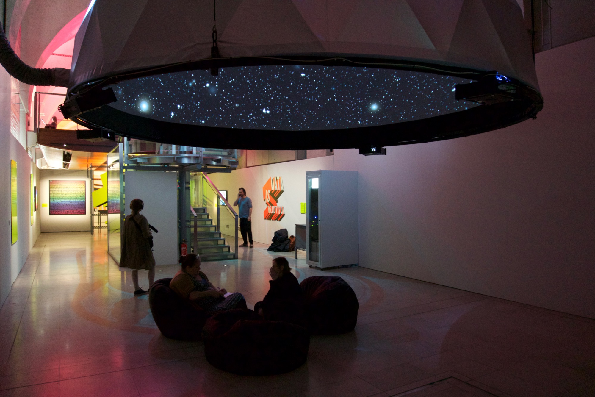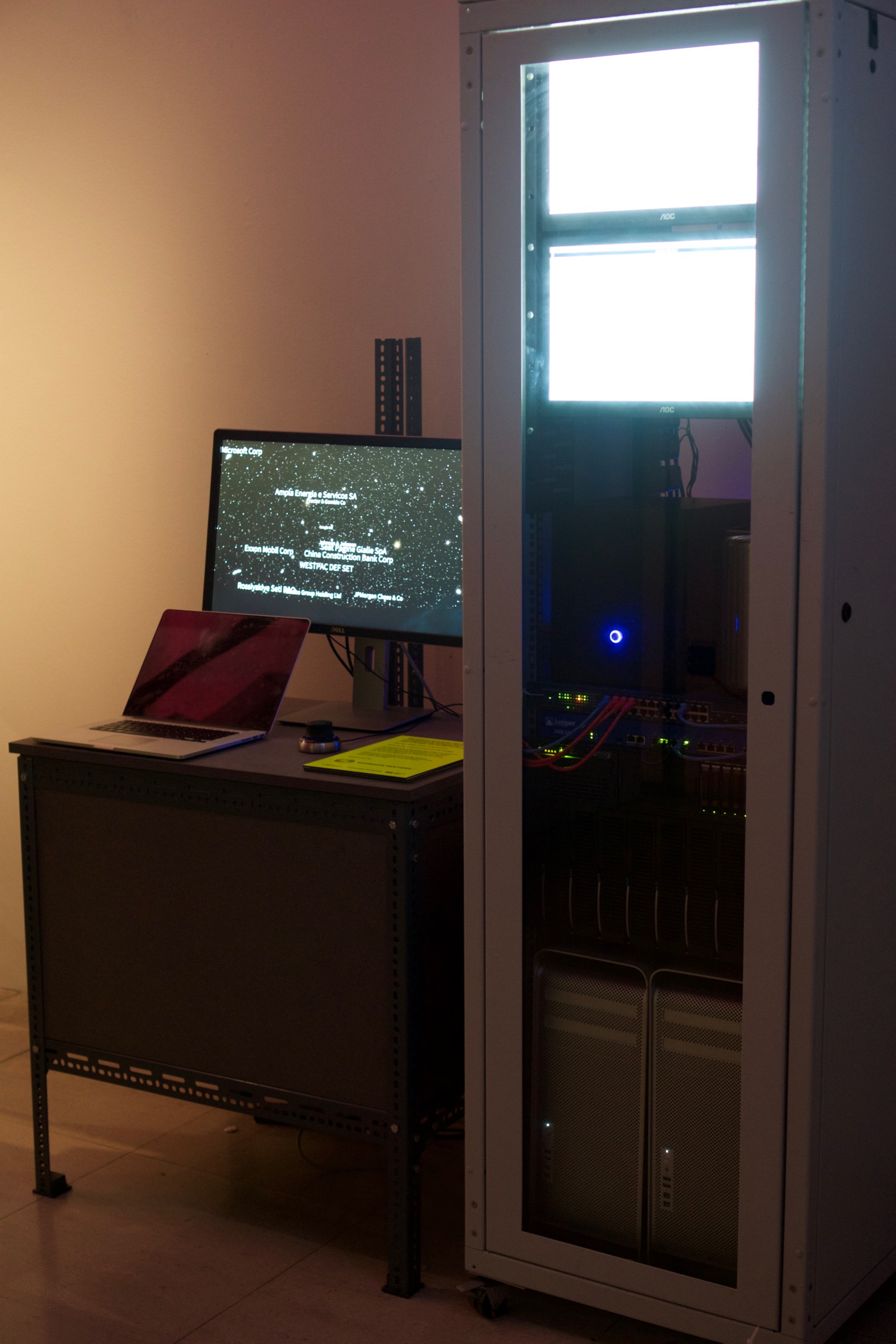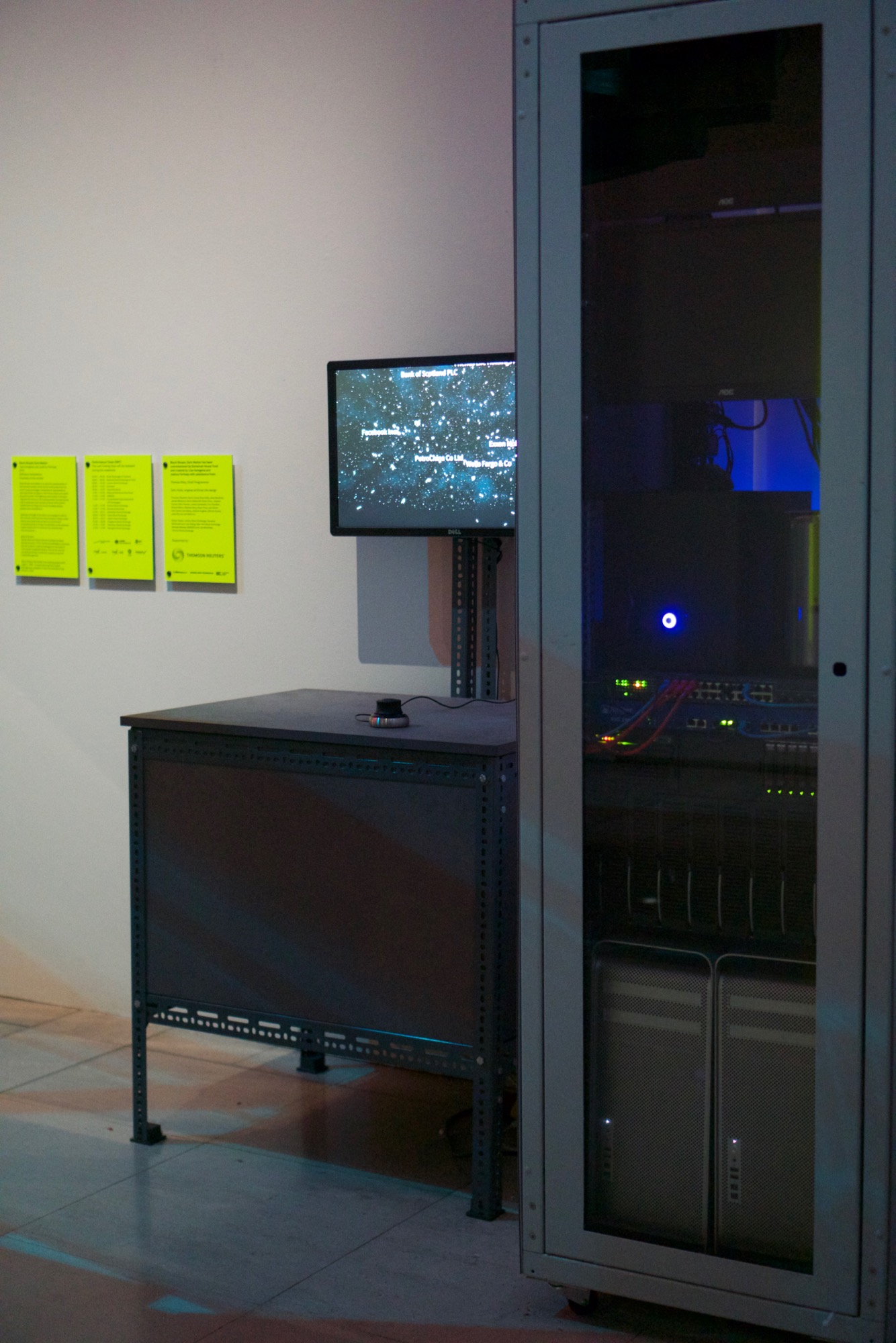 This installation was exhibited as the main installation at the Nikolaj contemporary art gallery, Copenhagen in Spring 2004 and again as part of the Big Bang Data exhibition at Somerset House, London in 2015 and again at the Art Science Museum in Singapore in 2016.