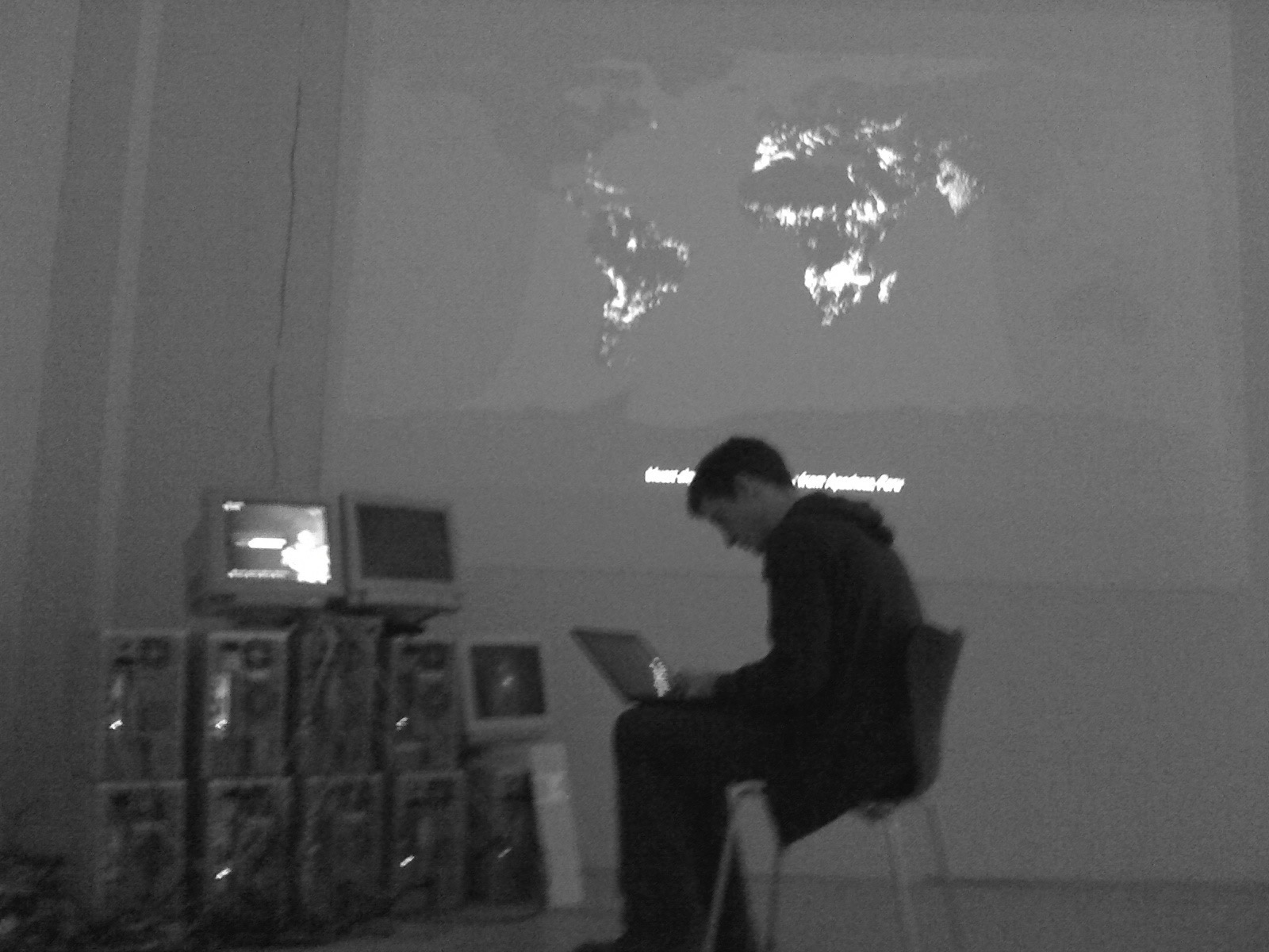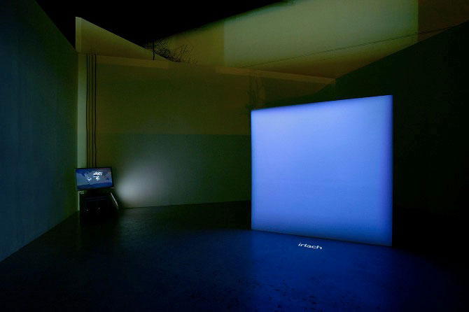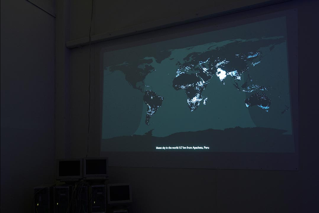 For the first showing of Most Blue Skies, a DMX controlled RGB stage light was used to project the sky colour onto a large freestanding square wall within the gallery space. Visitors could walk behind the wall to view the bank of colour-calculating computers and view a map of current sky colours across the Earth.